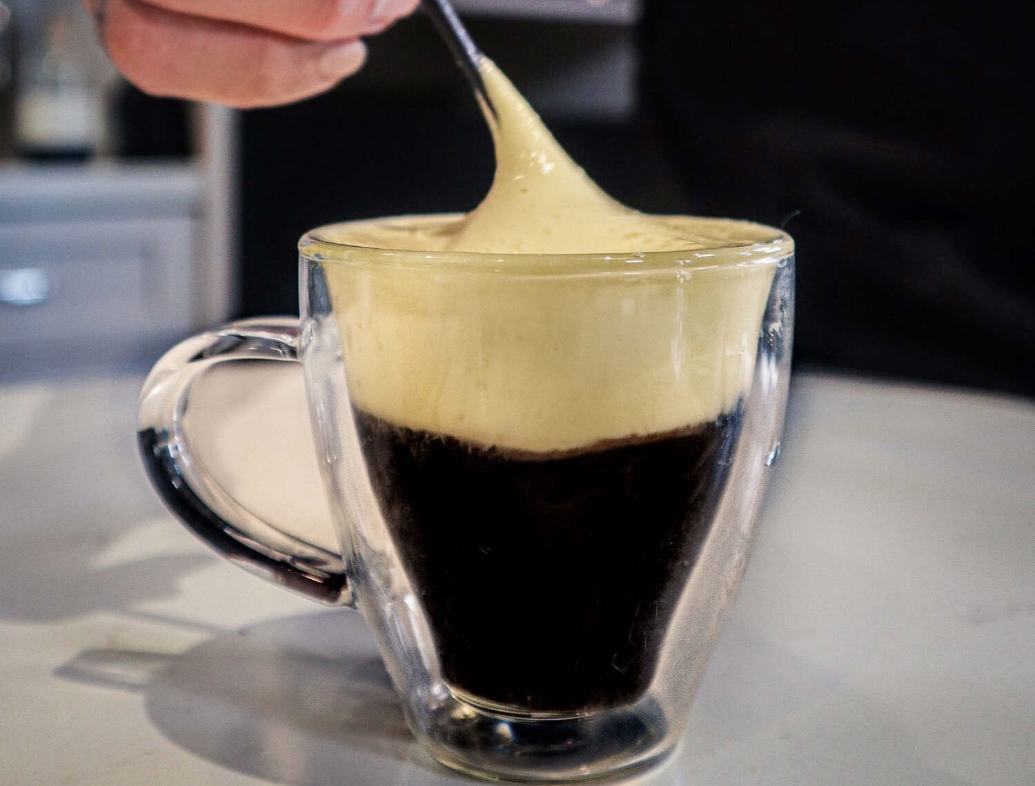 Cà phê trứng, Vietnamese egg coffee, is made by beating an egg yolk with sweetened condensed milk until it makes an airy, creamy, meringue-like fluff. Chef Tu says he thinks it’s better than traditional Vietnamese Coffee — and highly recommends adding a little cognac such as Ferrand.